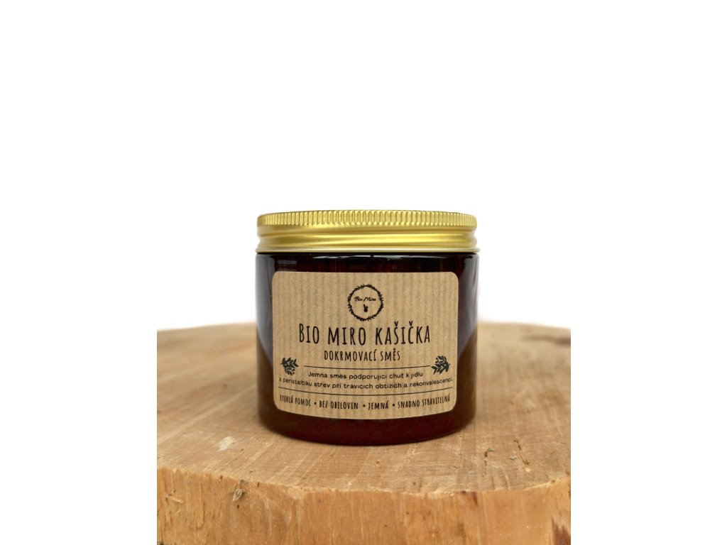 Bio Miro Kašička je jemně mletá, bezobilná dokrmovací směs určená k přechodné výživě králíků, morčat a dalších drobných hlodavců v období, kdy nejsou schopni nebo ochotni přijímat potravu sami. Slouží jako rychlá pomoc při nechutenství, trávicích obtížích, rekonvalescenci nebo po zákrocích, kdy je potřeba podpořit příjem živin, chuť k jídlu a správnou funkci trávicího traktu. Jedná se o jemnou směs, která po smíchání s vodou vytváří snadno stravitelnou kaši, vhodnou i pro krmení stříkačkou. Směs je zcela bez obilovin, založená na kvalitním lučním seně, bylinách, semenech a kořenech v potravinářské kvalitě.