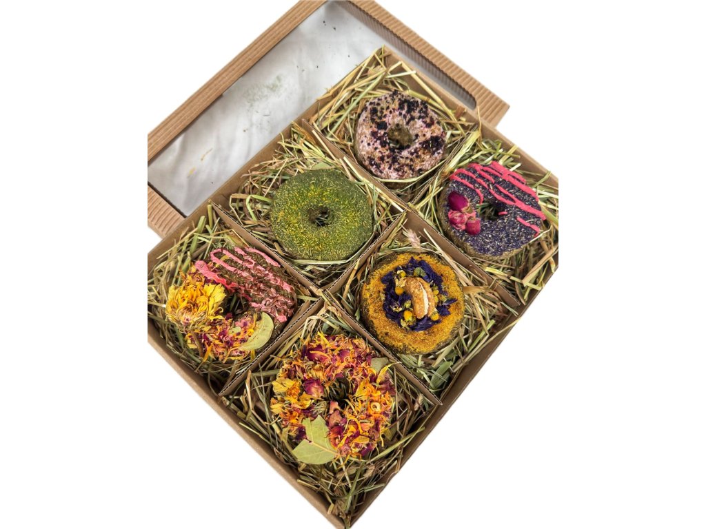 Pro speciální narozeninovou párty, za odměnu, nebo jako dárek je zde náš lahodný donutový box bez barviv, hrachu, škrobu a jiných nevhodných přísad. K vašemu chlupáčkovi dorazí dárkově zabalen, přesně jako je uvedeno na fotografii. Každý donut je navíc uložen na senném hnízdečku!