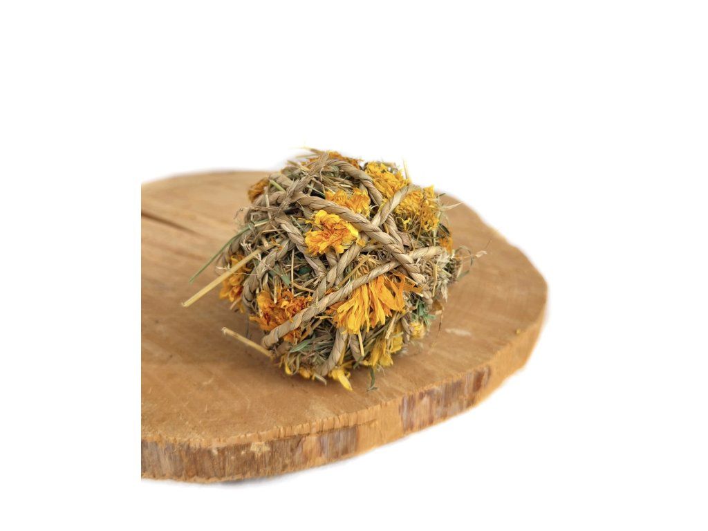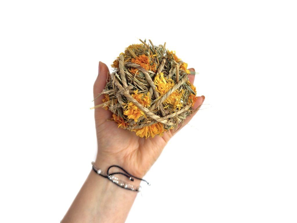 Základ tvoří kvalitní, voňavé seno bohaté na vlákninu, které podporuje správné trávení. Míček je následně pevně spleten lanem z mořské trávy, což zajišťuje jeho odolnost a zároveň bezpečnost při okusování. Do struktury míčku jsme navíc ručně vkládali sušené květy měsíčku, které jsou známé svými přirozenými