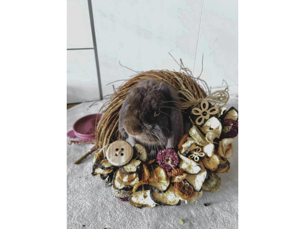 Dopřejte svému mazlíčkovi radost z přirozeného okusování i zábavu s tímto ručně vyráběným závěsným věncem pro králíky, morčata a jiné hlodavce. Věnec o průměru 25 cm slouží nejen jako vkusná dekorace ubikace, ale především jako přírodní hračka a pamlsek v jednom.